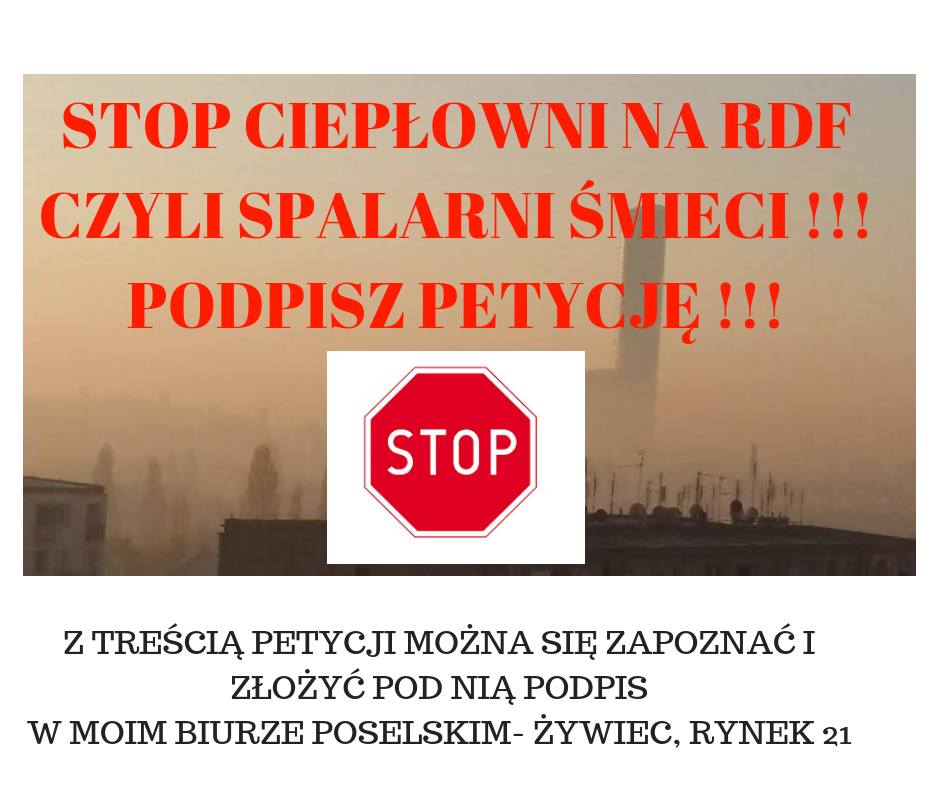 „Petycja przeciw spalarni. Wobec planów budowy na terenie Żywca, w pobliżu osiedla Kabaty ciepłowni na paliwo alternatywne RDF i biomasę, będącą po prostu spalarnią śmieci, zgłasza się do mnie wielu mieszkańców miasta, oburzonych prowadzeniem procedur, zmierzających do uzyskania stosownych pozwoleń na realizację tej inwestycji. Od jutra można będzie w moim biurze poselskim (Żywiec, ul. Rynek 21) podpisać petycję pn. „Nie” dla spalarni śmieci w Żywcu czyli ciepłowni na RDF i biomasę. Wszystkich, którzy są przeciwni tej inwestycji, chcą innych rozwiązań w gospodarce odpadami komunalnymi, zapraszam do składania podpisu. Państwa dane osobowe nie będą ujawnione.” - czytamy na stronie FB Małgorzaty Pępek.