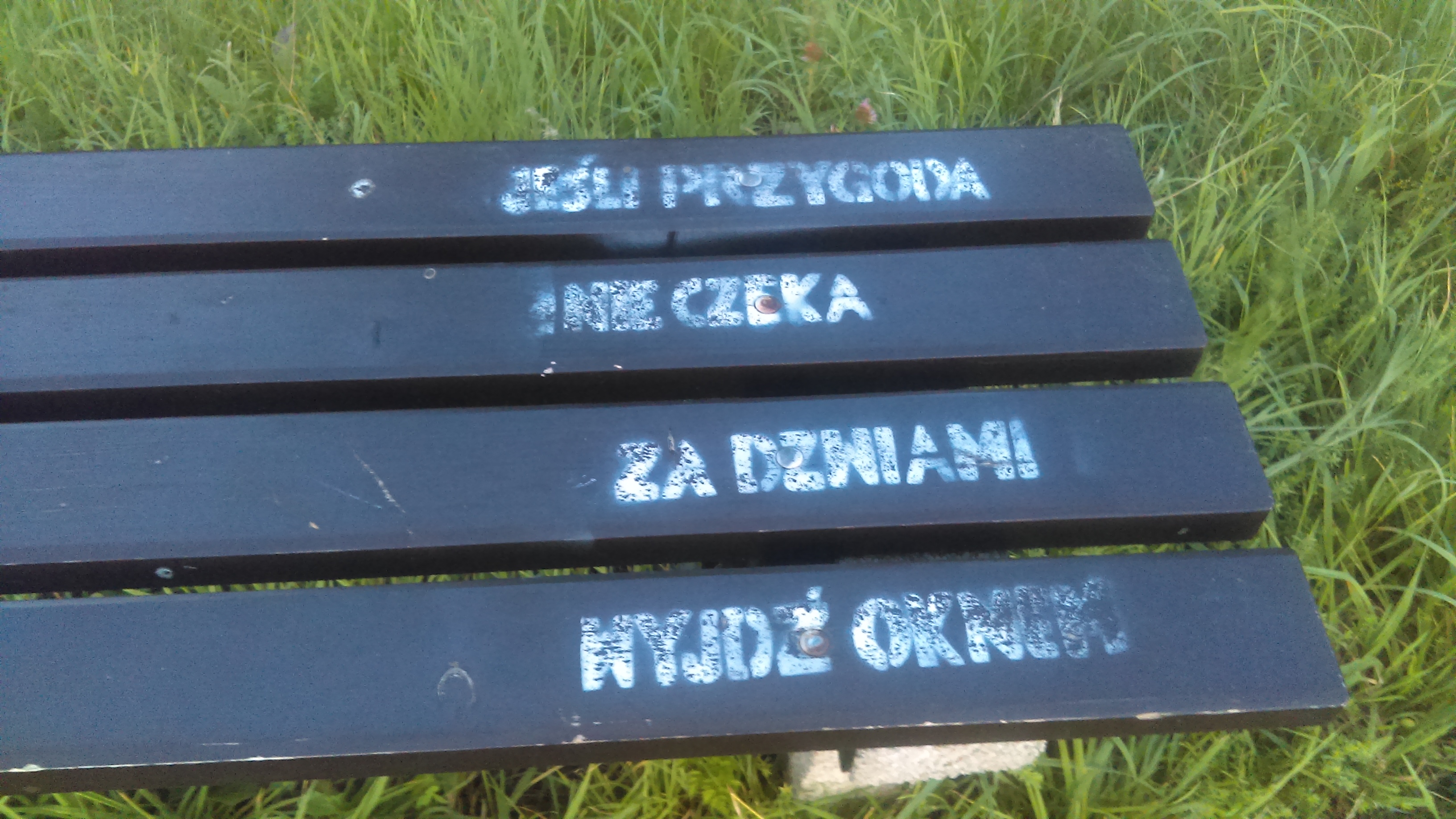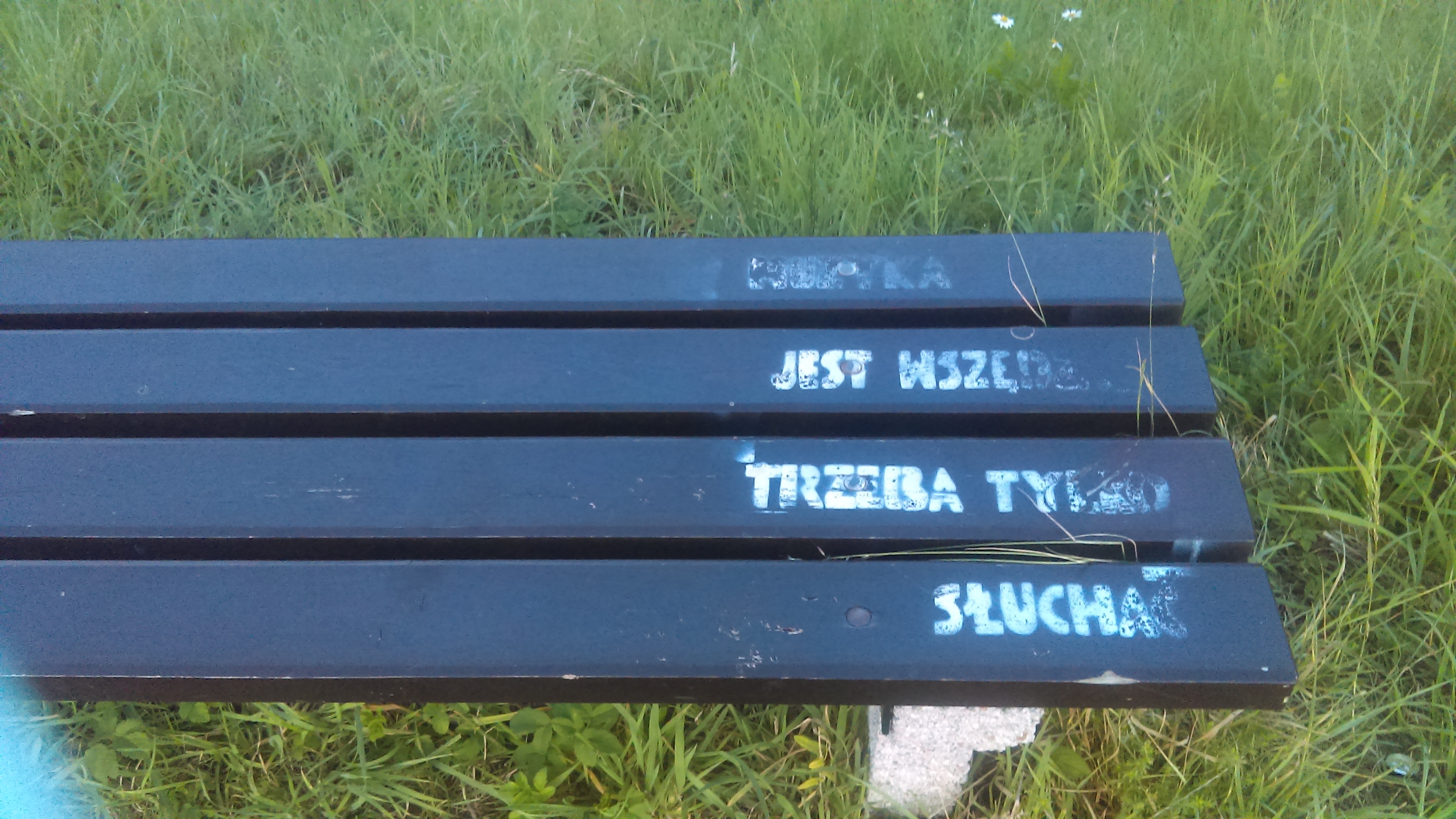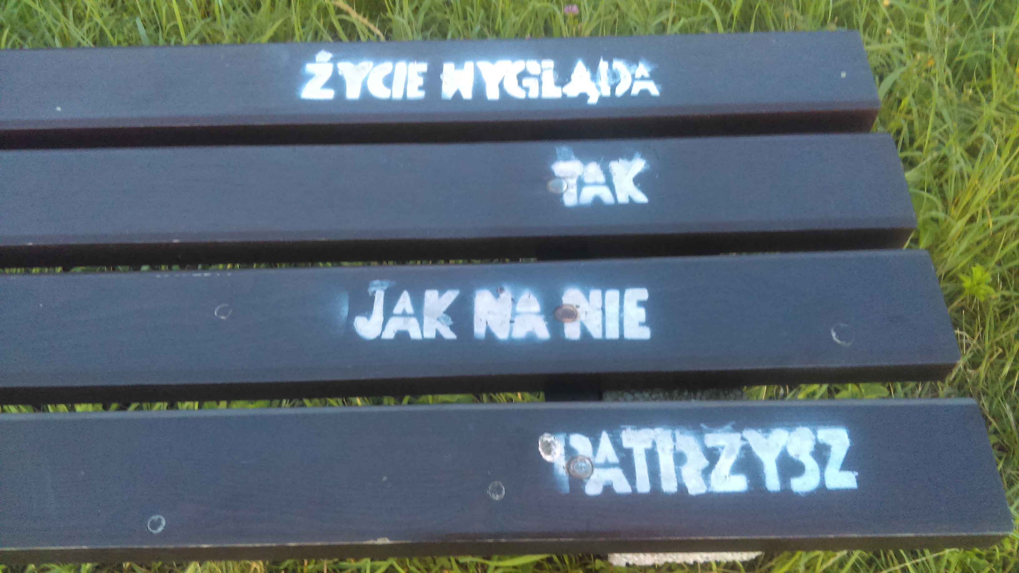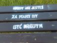 Niedawno te ławki, prawie wszystkie zostały przyozdobione kilkuwyrazowymi napisami. Raczej nie są one autorstwem zarządzających nimi. Fotocytaty w galerii. Przy okazji prośba do ich autora o brak obrazy, jeśli nie będzie zachowana ich kolejność, a miałaby mieć znaczenie.