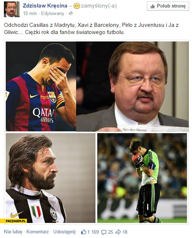 Wszyscy na pewno kojarzą tę osobę, którą tyleż samo często określano szarą eminencją polskiej piłki, co i jej barwną postacią. Zdzisław Kręcina szybko i na długo stał się częstym i głównym obiektem internetowych żartów i MEMów. Trzeba przyznać, że były wiceprezes na taką percepcję zasługiwał. Zarówno powierzchowność jak i jego postawa kojarzyły się wielu ze słusznie minioną epoką. W memach żartowano, jak to pan Zdzisław załatwia coś komuś po kryjomu, jak to wszystko gra dzięki niemu. Pojawiały się w nich hasła: ”tera ja za Blattera”, „Od Chicago po Wodzisław, na prezesa tylko Zdzisław”, czy też: „Z takim nazwiskiem nie powinni mu pozwolić zbliżać się do pieniędzy”.