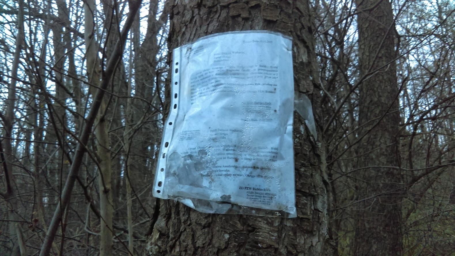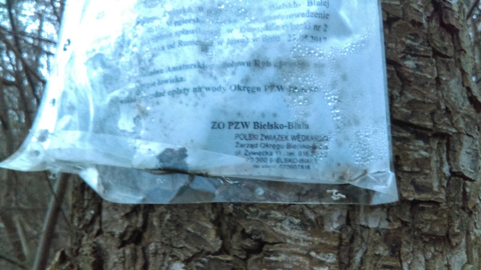 W zatoczce Moszczanki można znaleźć całe sterty odpadów naniesionych nie przez spływające wody. Zdziwiła nas jednak najbardziej przybita do drzewa zafoliowana kartka formatu A4 z informacją o zawodach wędkarskich. U dołu pieczątka Zarządu Okręgowego Polskiego Związku Wędkarskiego w Bielsku – Białej, a na górze data: 15.05.2017 r.