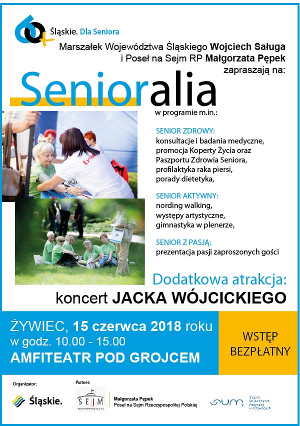 Poseł Małgorzata Pępek oraz marszałek województwa śląskiego Wojciech Saługa zapraszają na Senioralia 2018, które odbędą się w piątek 15 czerwca od godz. 10.00 w Amfiteatrze Pod Grojcem w Żywcu. Będzie to okazja nie tylko do odbycia bezpłatnych konsultacji i badań lekarskich, spotkania z policjantami i sportowcami, ale też wysłuchania występu Jacka Wojcickiego, znanego między innymi z występów w Piwnicy Pod Baranami i Kabarecie Olgi Lipińskiej. Wstęp jest bezpłatny. szczegóły na plakacie.