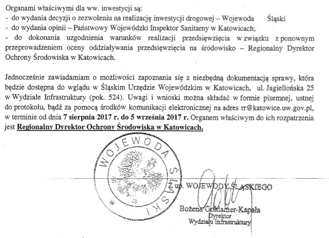 Wojewoda Śląski 27 lipca 2017 roku zawiadomił o wszczęciu postępowania w sprawie przeprowadzenia ponownej oceny oddziaływania na środowisko (OOS)...